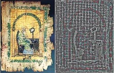 Um dos mais famosos palimpsestos é o de Arquimedes. Trata-se de uma cópia em 170 páginas, manuscrita em fina pelica de carneiro, da obra O Método, de Arquimedes de Siracusa, feito por um escriba bizantino do século X, e raspado no final do século XII ou princípio do século XIII para dar lugar a um livro de orações. A obra foi desmontada por um monge de Jerusalém, em 1229. Ele raspou o texto, cortou as folhas ao meio e as encadernou novamente, escrevendo orações e pintando iluminuras sobre o delicado pergaminho. Veja a ilustração acima: do lado esquerdo à iluminura e do direito o texto de Arquimedes.